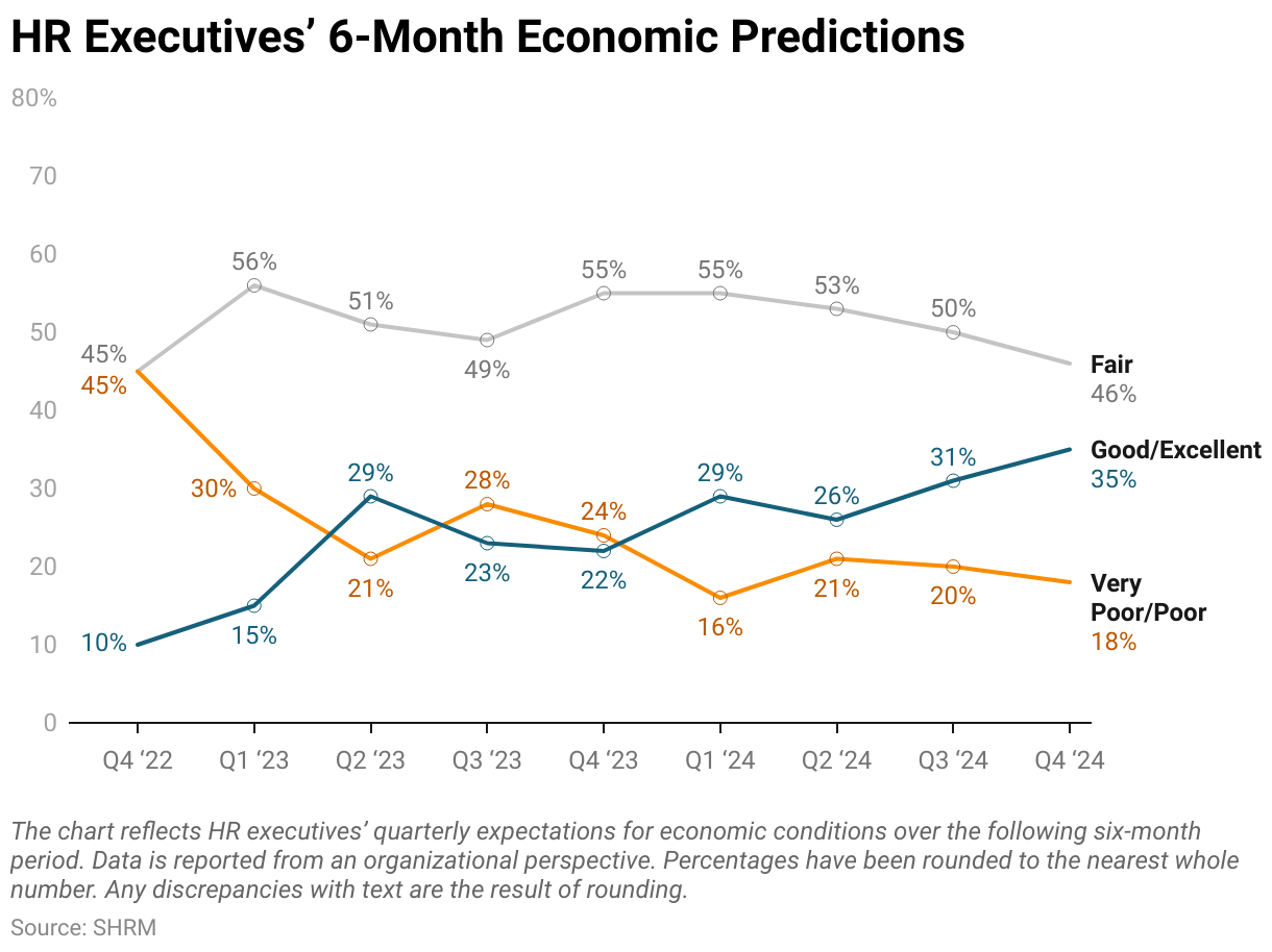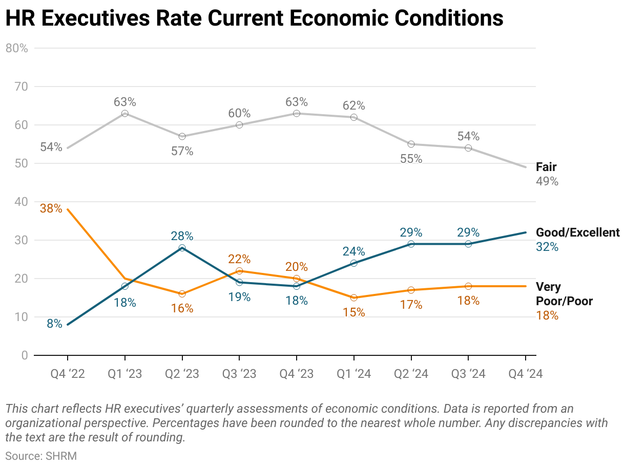After a major shift toward a negative outlook in Q2 2025 and a return to average in Q3 2025, positive ratings among HR executives declined in Q4 2025 while negative and fair ratings increased. Currently, 54% of HR executives rated economic conditions as fair, while 26% rated conditions as poor (23%) or very poor (3%). Still, about 1 in 5 HR executives (21%) have a positive view (19% as good and 2% as excellent).