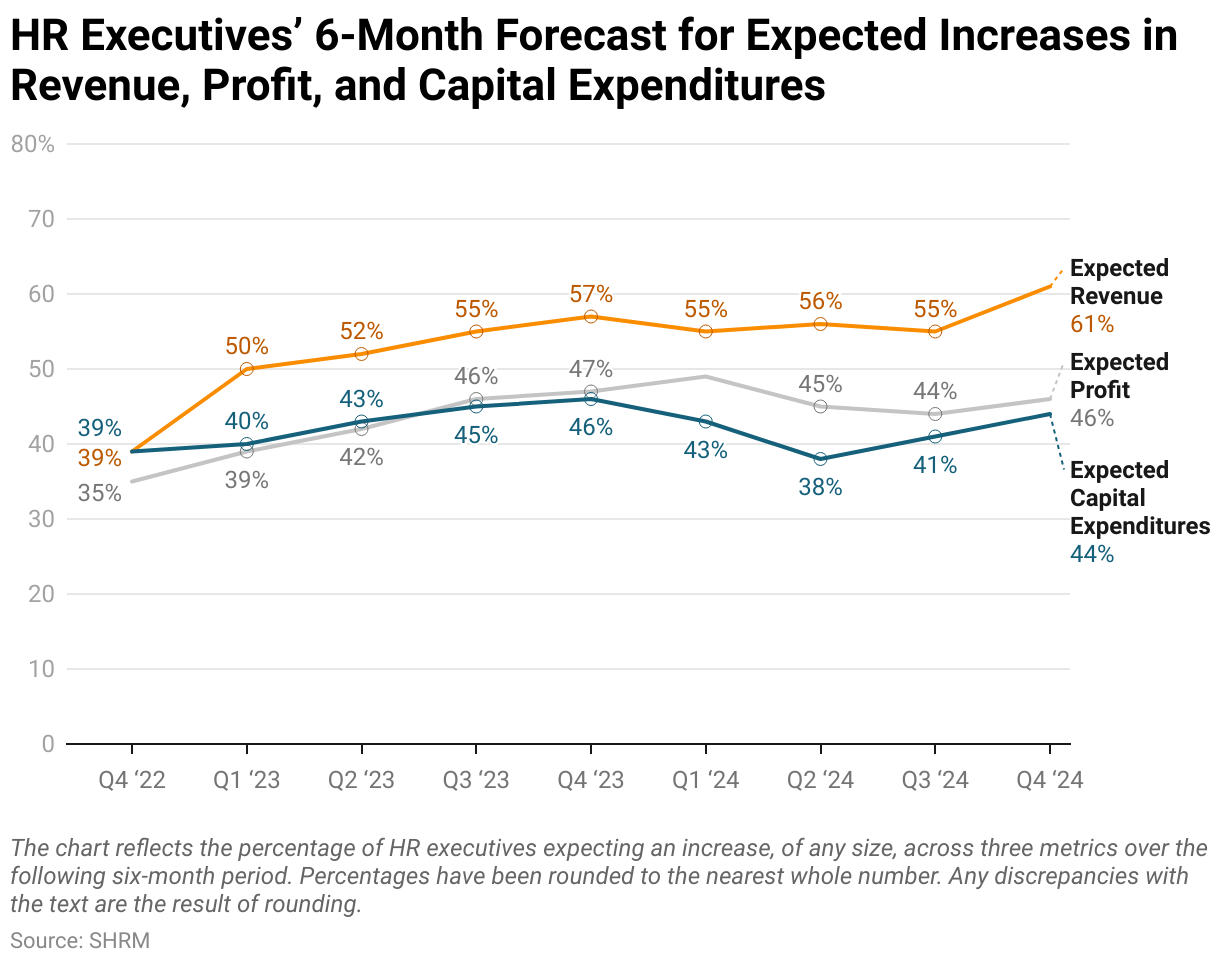 - Capital expenditures: 35% of HR executives expect an increase (no change from Q3 2025).