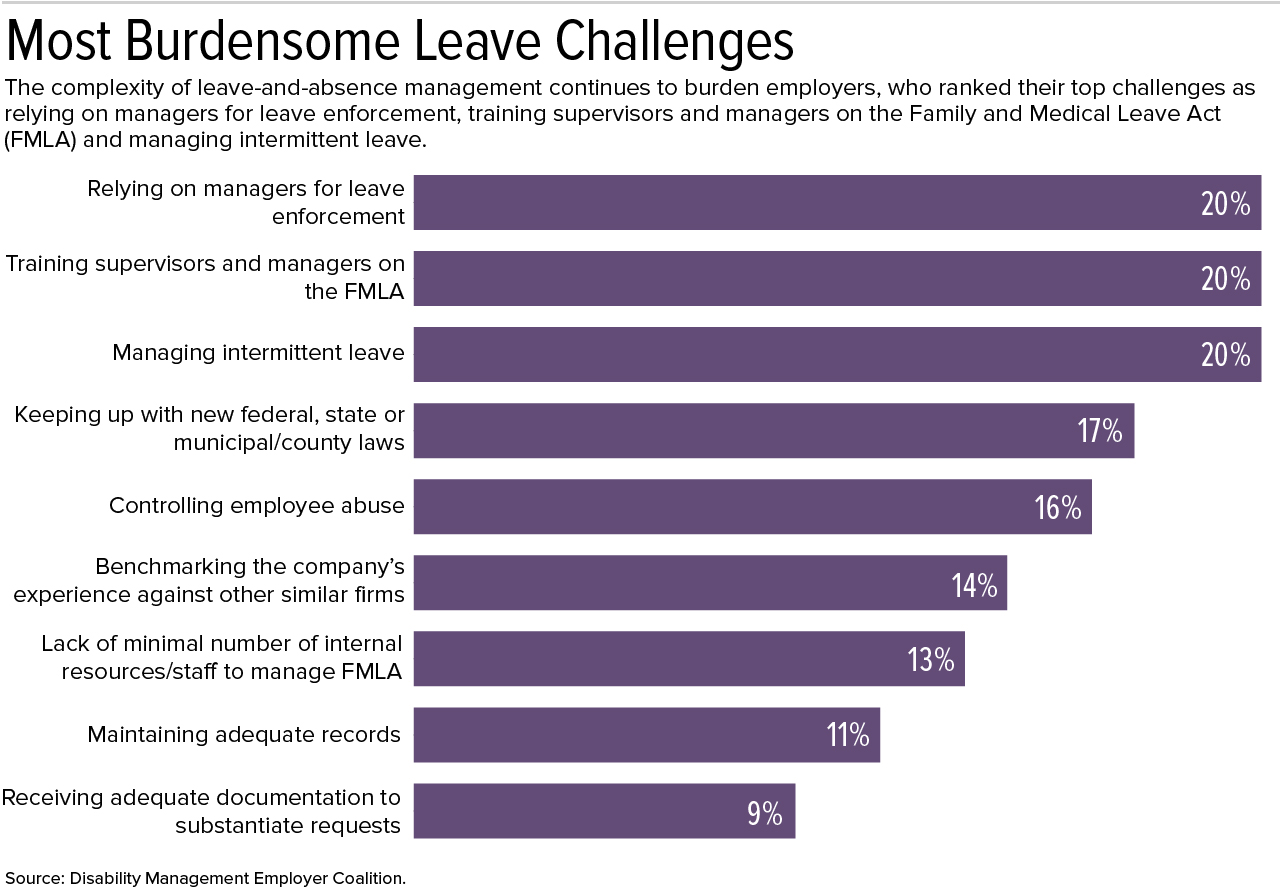 Intermittent leave time, taken in separate blocks of time for a single illness or injury, is still the most difficult FMLA activity to manage for employers of all sizes and industries, the survey showed.
