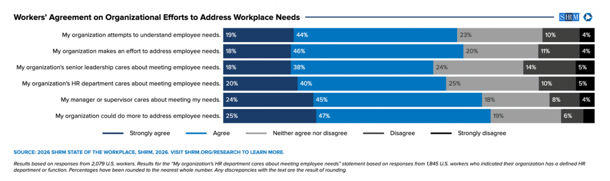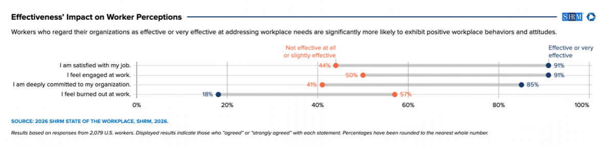 The SHRM 2026 State of the Workplace research points to a growing gap between organisations that effectively support workers and those that don’t. Employees who perceived their organisations as ineffective in addressing their workforce needs have a lower satisfaction level (only 44% are satisfied) and much higher turnover intentions (51% indicated they are somewhat likely to leave), signaling that workplace support (culture, development, leadership) is now a competitive differentiator. This gap is clearly visible with more than three-quarters of workers who said they view their organization as effective or very effective at addressing needs (77%) indicated it is at least somewhat unlikely they will leave, including 62% who reported it is unlikely or very unlikely.