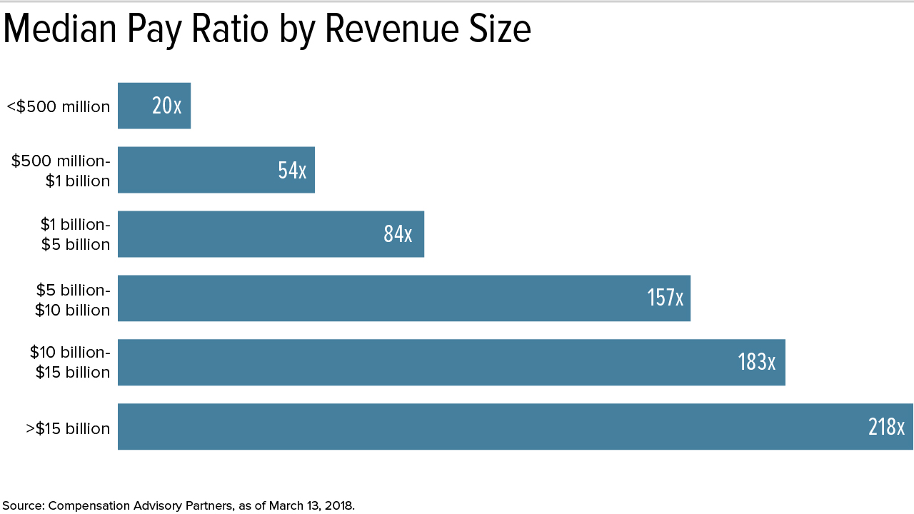 CAP also found that the pay ratio correlates with company size, with larger companies disclosing higher ratios. "The median ratio in our sample of 150 companies ranges from 20x [times median-employee pay] for companies with revenue less than $500 million to 218x for companies with revenue greater than $15 billion," the report stated.