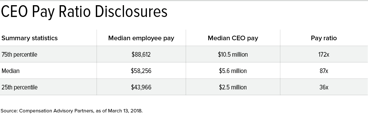 A March 13 report by New York City-based pay consultancy Compensation Advisory Partners (CAP) found that the median pay ratio disclosed so far was 87 times median-employee pay, based on proxy statements the firm analyzed.