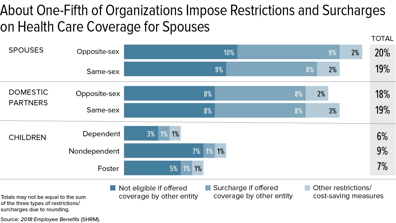 The most common restriction, imposed by 10 percent of organizations, is making spouses ineligible for health plan enrollment if they are covered by another organization, such as their own employer. Alternatively, 9 percent of employers apply a surcharge on spouses offered coverage by another entity.