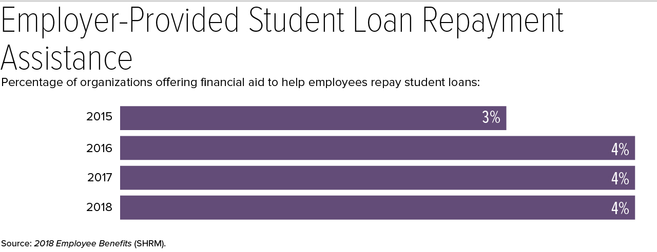 Company-provided student loan repayment was offered by 4 percent of organizations, a figure unchanged since 2016 (SHRM first began surveying members about the issue in 2015). Employers appear cautious about adding a new and potentially expensive financial benefit, even if it is highly valued by job candidates carrying student debt.