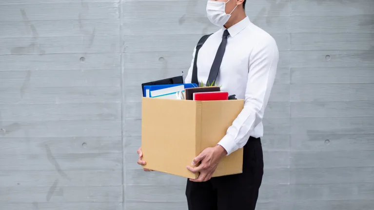 A businessman wearing a face mask holding a box.
