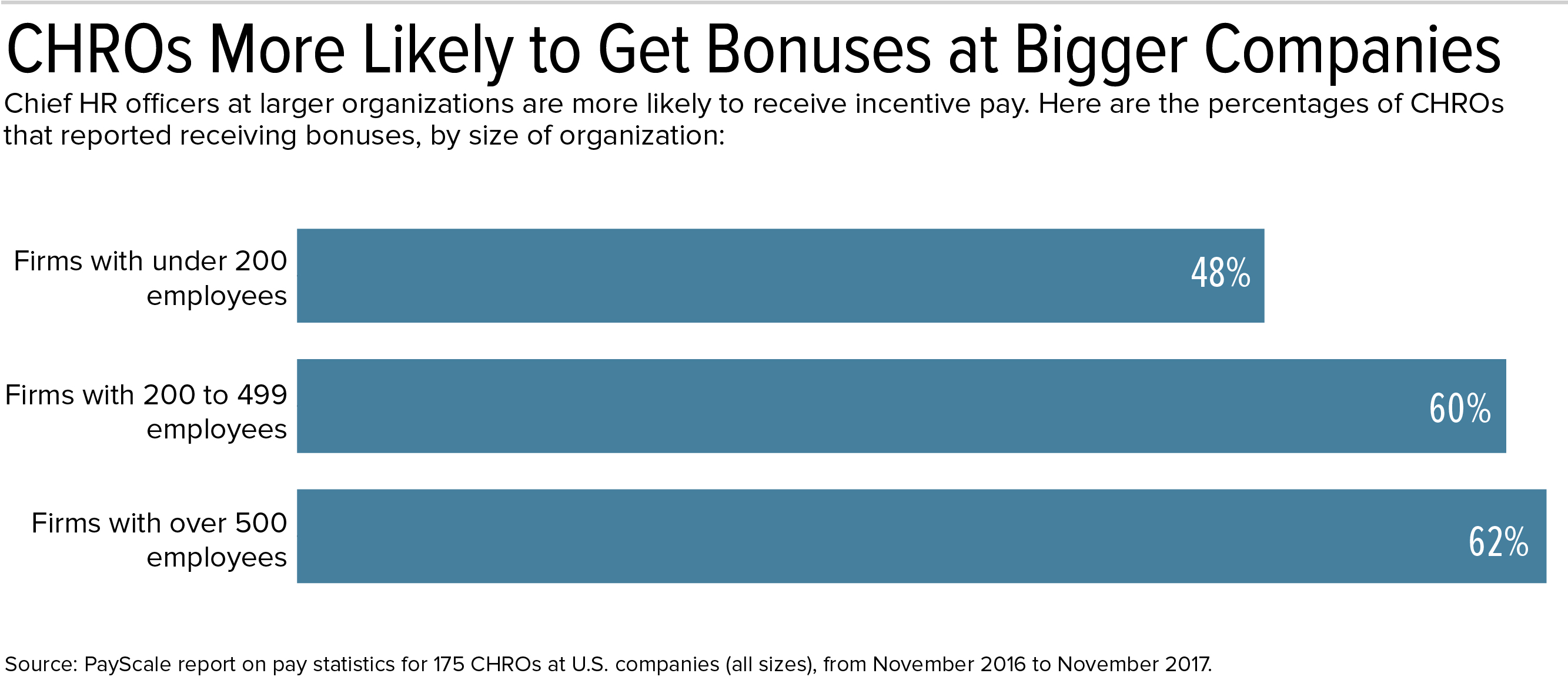 Source: PayScale data for 175 CHROs at U.S. companies (all sizes) from November 2016 to November 2017. Roughly half of CHROs did not receive a bonus. CHROs receiving the median base pay are not the same as those receiving the median bonus.
