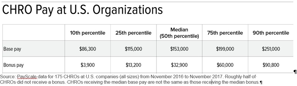 Most CHROs don't earn multimillion-dollar pay, however. According to the latest findings by PayScale, a Seattle-based compensation data firm, CHROs in the U.S. overall more typically earn salaries of about $153,000 annually, and roughly half receive incentive bonuses.