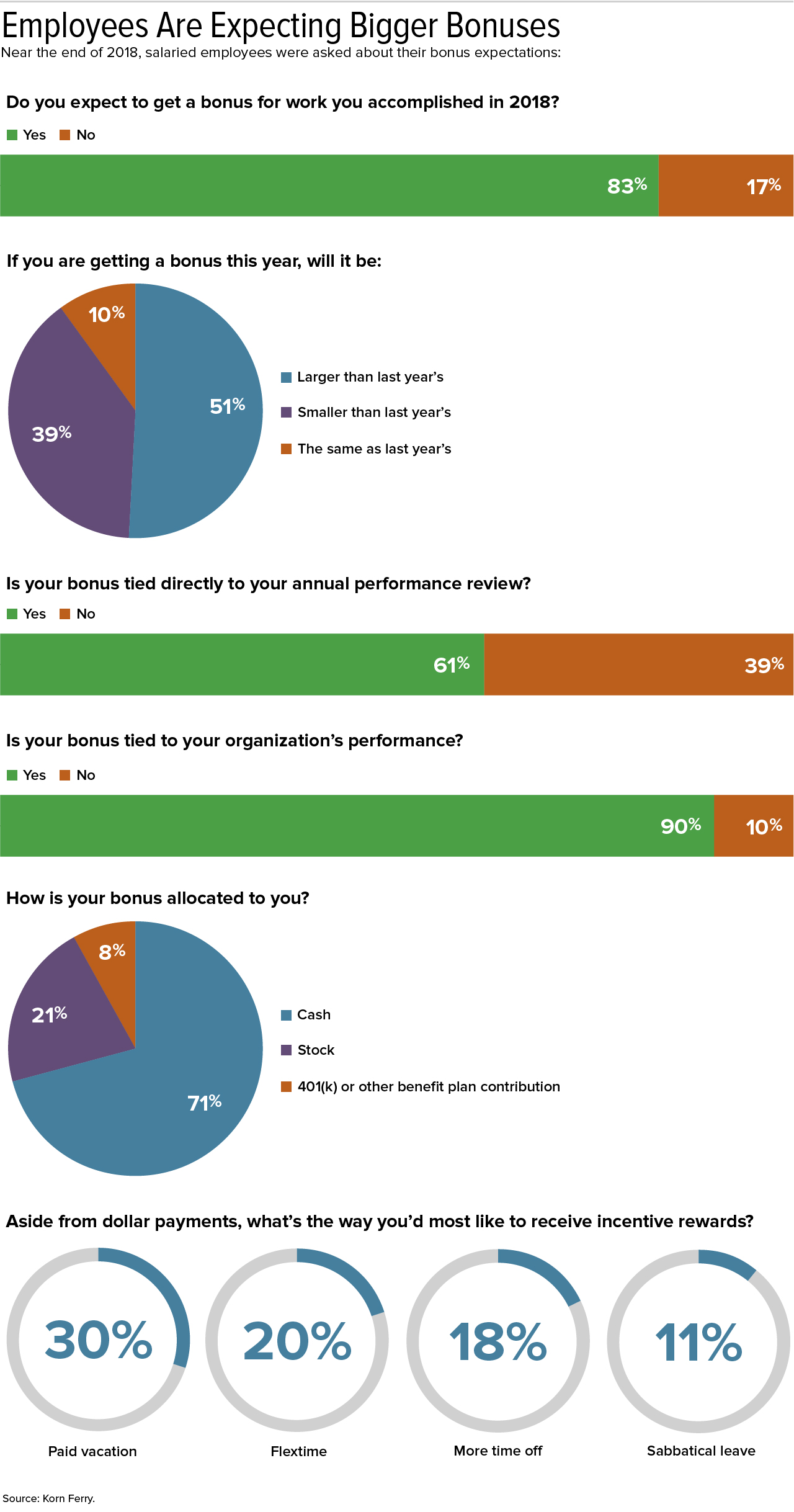 According to a new survey by HR consultancy Korn Ferry, around 83 percent of employees surveyed said they expect to receive a bonus this year for work performed in 2018. This is in line with the percentage who said they received a bonus last year for their work in 2017.