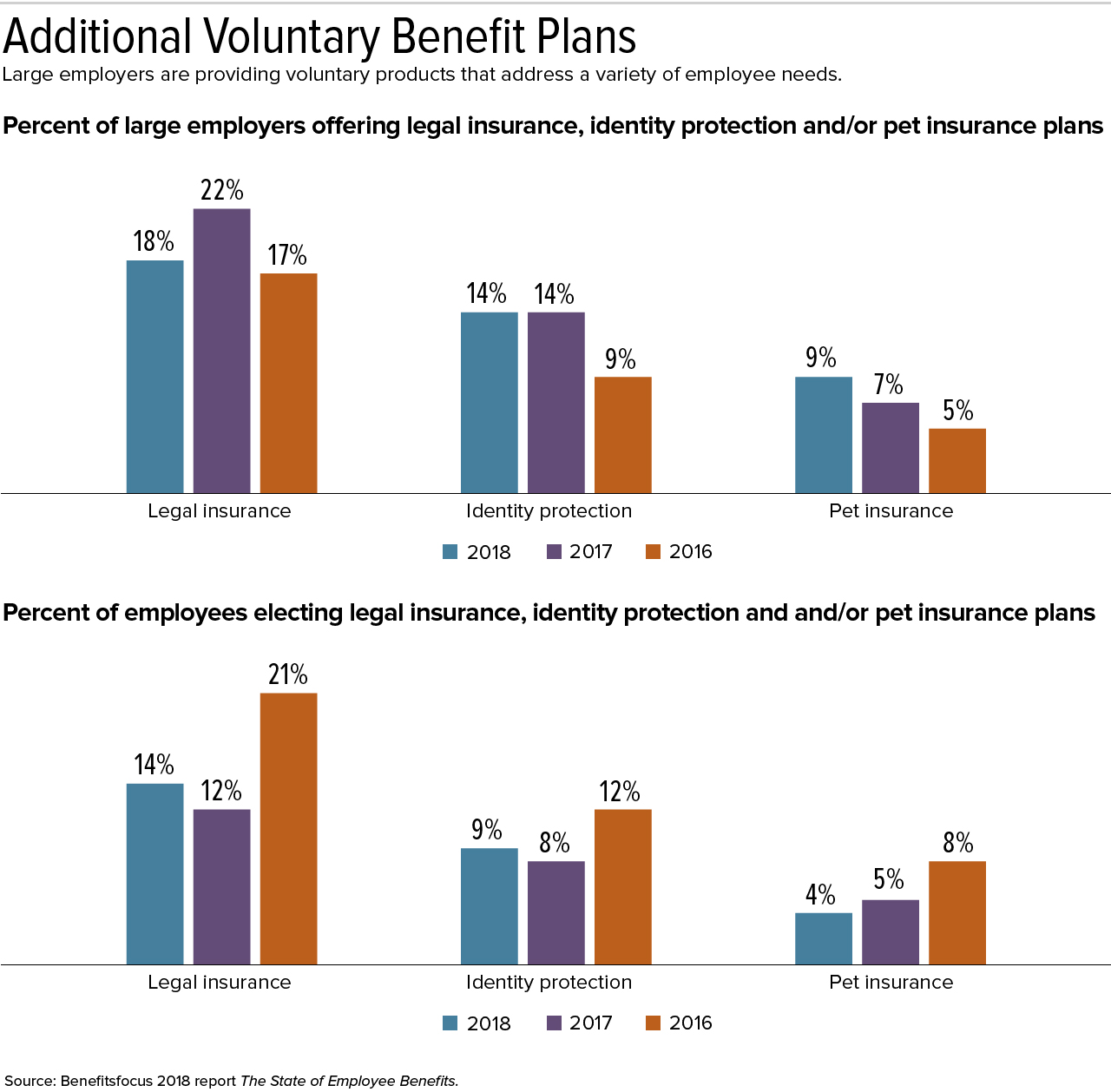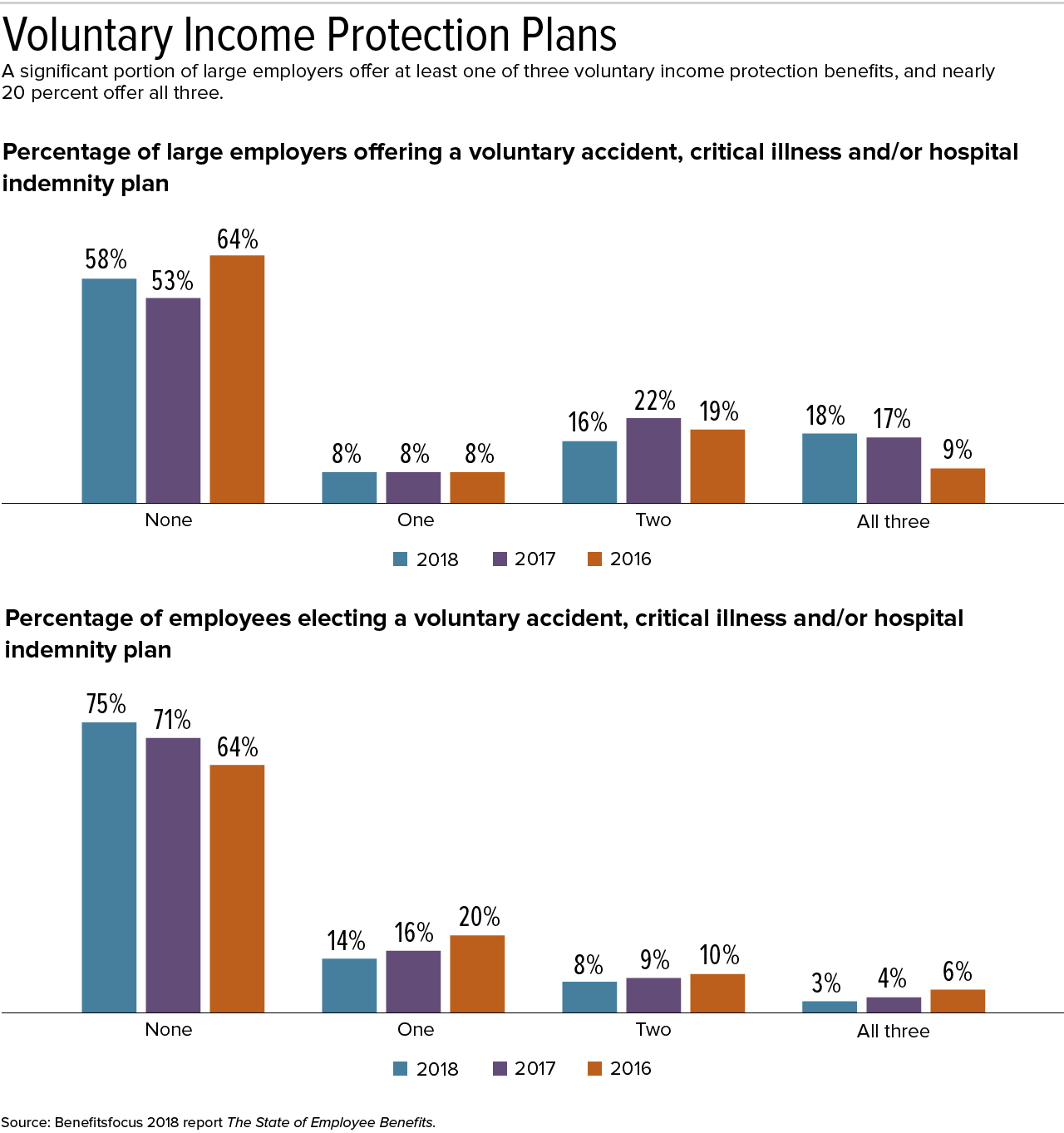 "For 2018, 42 percent of employers offered at least one of three voluntary income protection benefits to their employees—voluntary accident, critical illness and/or hospital indemnity plans—and 18 percent offered all three," said Justin Verona, Benefitfocus lead researcher and co-author of the report. Those numbers are up from their 2016 levels.